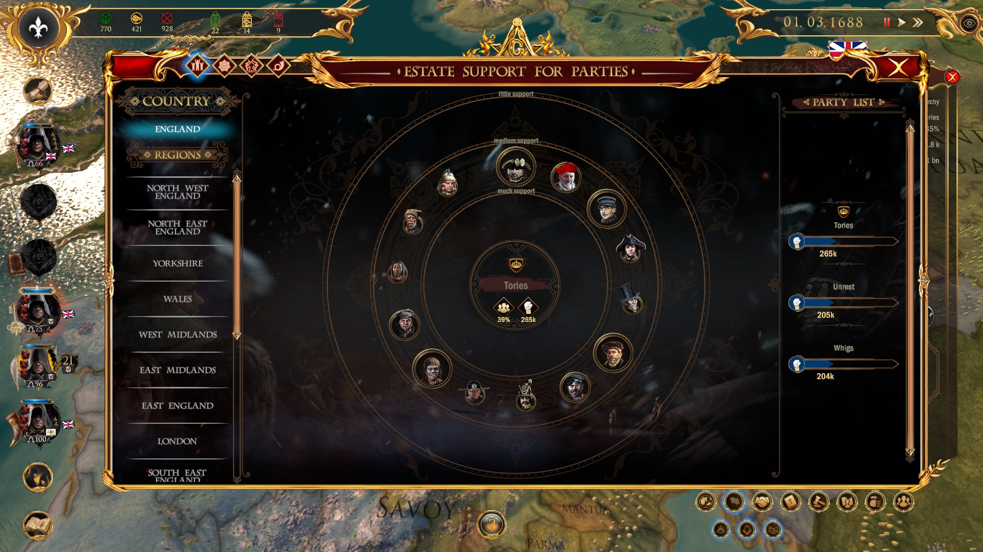 Вам будет доступно множество действий, связанных с дипломатией, экономикой и военным делом. Следите за внутренней политикой в каждой стране! Если идеология правящей партии будет сильно отличаться от взглядов разных сословий, если уровень налогов будет слишком высоким, а уровень общественного порядка слишком низким — ждите революции. Хотя, может, этого-то вы и добиваетесь?